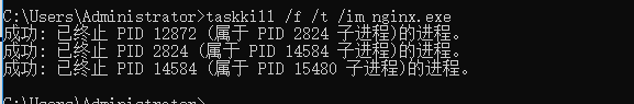 (2)只需要打开cmd命令窗口,输入指令 taskkill /f /t /im nginx.exe 出现以下内容即可: