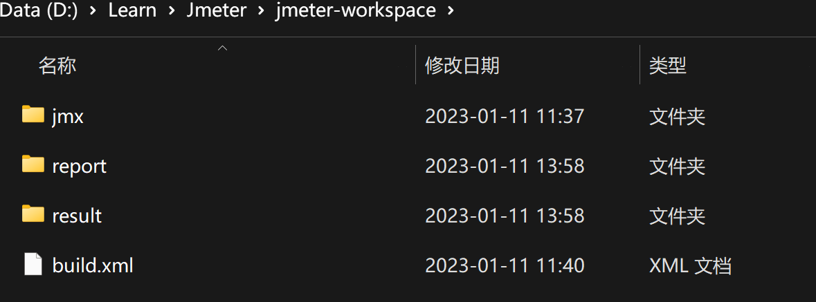 在任意英文目录下新建一个脚本目录 jmeter-workspace,将build.xml 文件放在目录下,并创建其他文件夹,目录结构如下: