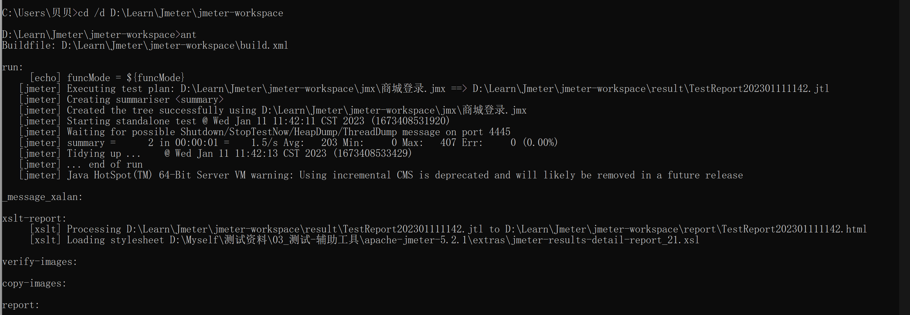 2、cmd进入jmeter目录执行命令jmeter -n -t 商城测试.jmx -l testreport.jlt -e -o Beireport
