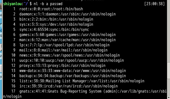 nl filename //查看文件,显示行号,并且比前两个显示更专业