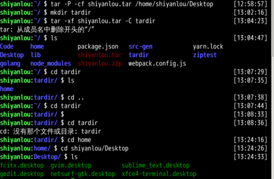 tar –cvf *.tar /home/shiyanlou/Desktop //打包/home/shiyanlou/Desktop目录*.tar
