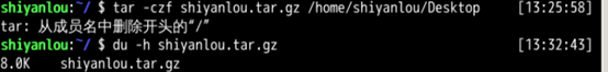 tar –czf *.tar.gz /home/shiyanlou/Desktop //打包/home/shiyanlou/Desktop目录为*.tar.gz