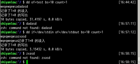 dd if=/dev/stdin of=/dev/stdout bs=10 count=1 //输出到标准输出