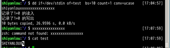 dd if=/dev/stdin of=test bs=10 count=1 conv=ucase //dd在拷贝的同时还可以实现数据转换,将输出的英文字符转换为大写再写入文件