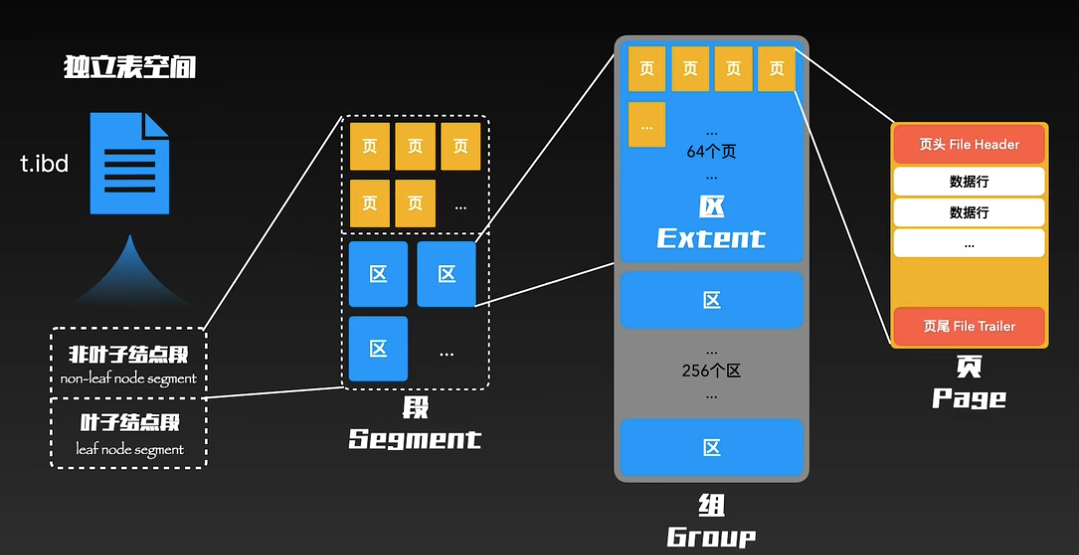 当随着我们的数据量增大,页的数量增大时,会引入新的结构**区**,一个区有32个页,之后在申请空间一次申请一个区,进一步又引入了组,一个组256个区