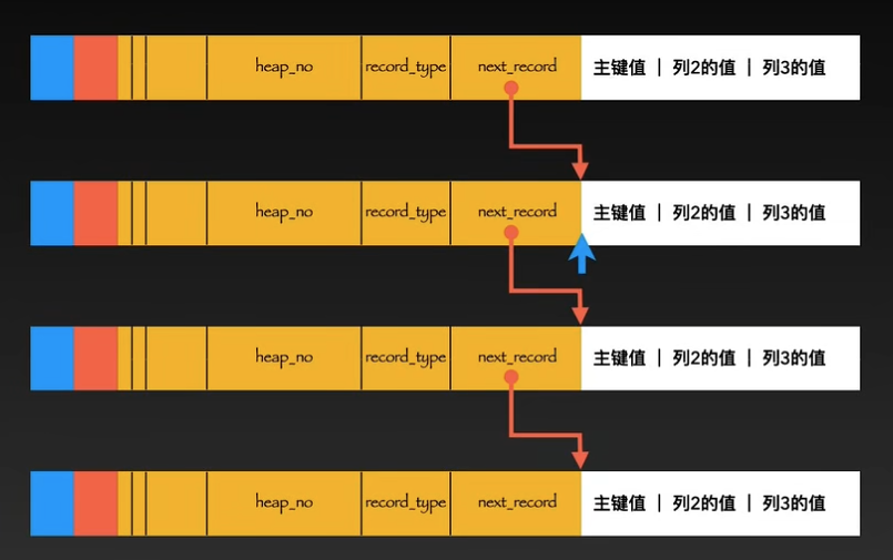 所有的行通过next_record链接起来。其中还有两个特殊的行用来作为链表的头和尾 ,构成一个单项链表。