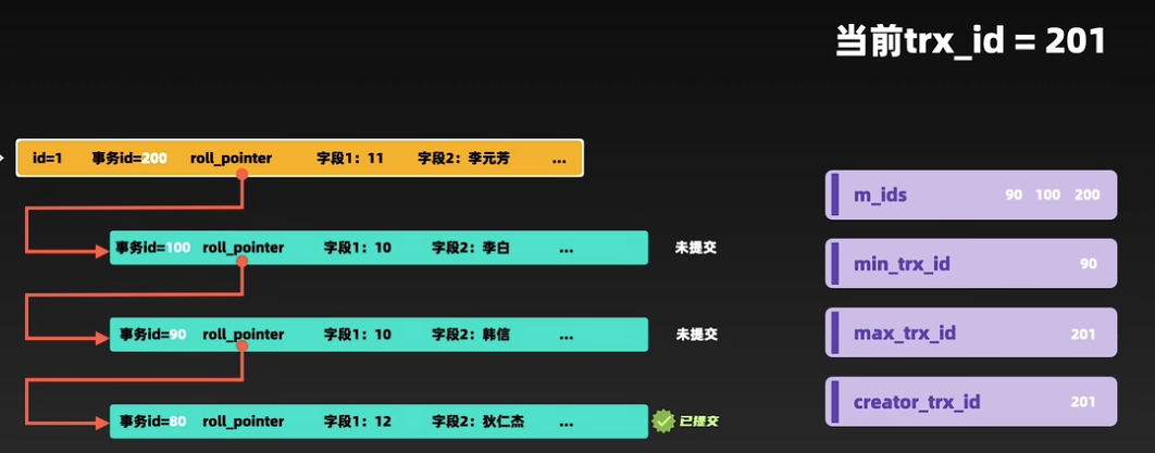 在链表中从第一条开始查找,查找规则,trx_id为当前查找行的id