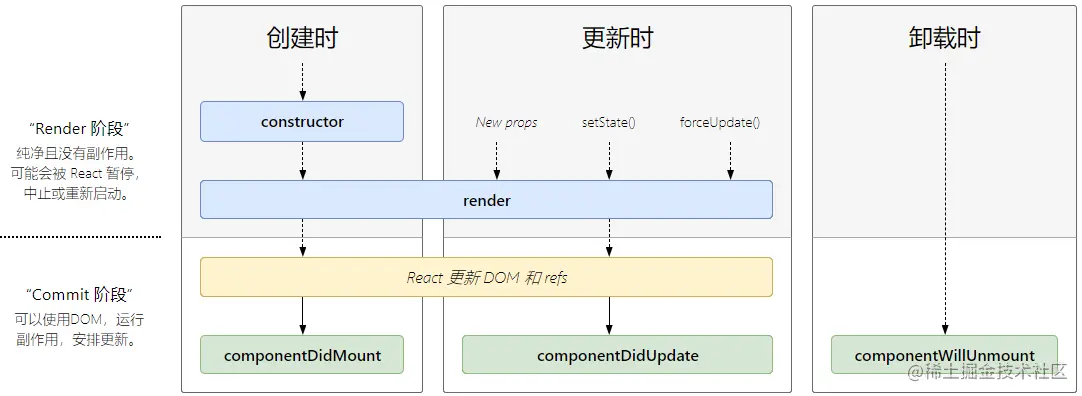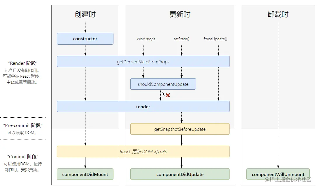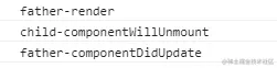 • 父元素卸载子元素时,先render,然后卸载了子元素,最后componentDidUpdate