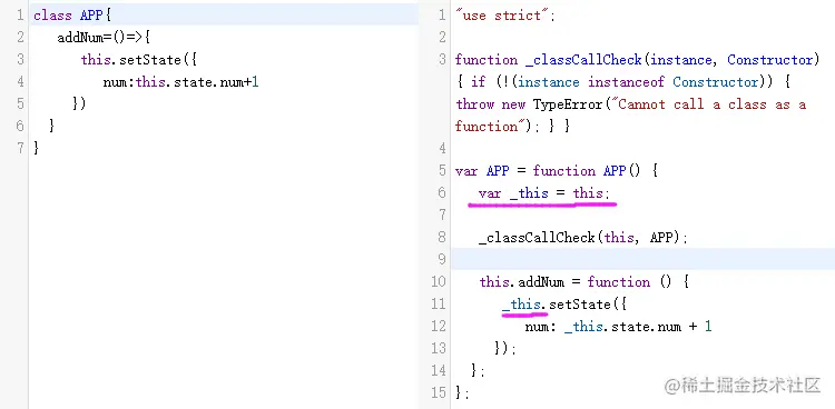 这里有一个小tips,我感觉大家很容易犯错的地方,有关箭头函数的this指向问题,大家看下图。箭头函数转化成ES5的话,我们就可以很清晰得看到,箭头函数指向他上一层的函数对象。这里也就指向App这个对象。