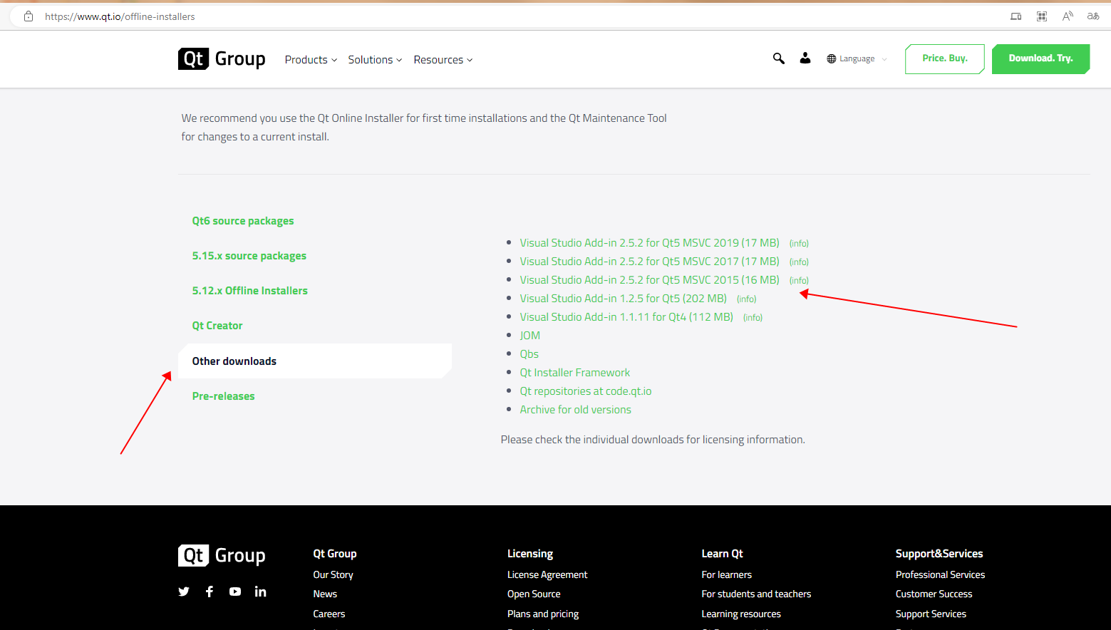 4、如果提示MSVC 异常,可以在下载源包脱机安装程序 |Qt 界面,点击Other downloads 下载并安装对应的插件