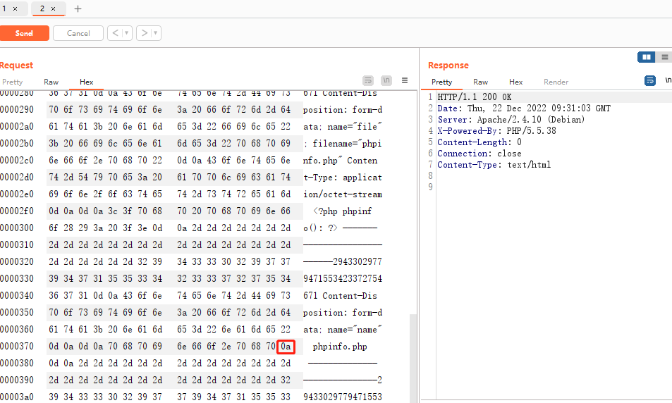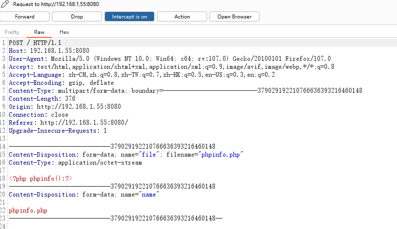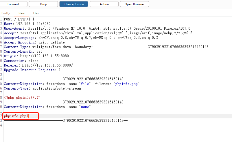 直接访问上传的文件地址,url最后面需加上%0a http://192.168.155:8080/phpinfo.php%0a