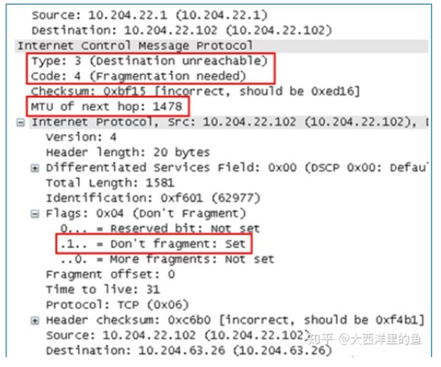 我们可以看到其差错类型为3,代码为4,并且告知了下一跳的MTU值为1478。在ICMP差错报文里封装导致此差错的原始IP报文的报头(包含IP报头和四层报头)。