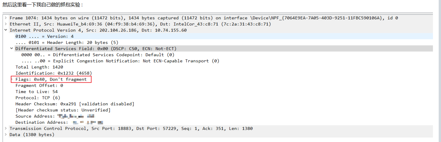 你也看到了以太网MTU一般为 1500 个字节, 也就是说超过 1500 个字节的数据就会分包发送,那么我们反推一下 ,