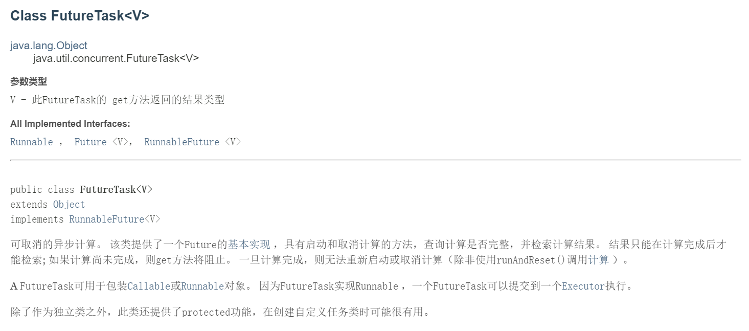 - 上面是使用Callable接口简单实现多线程,使用这个接口要使用FutrueTask类作为简单的适配类,因为Thread构造方法只能接受Runnable接口参数,下面源码中看出FutrueTask的对象为什么也能作为Runnable型参数传给Thread构造方法