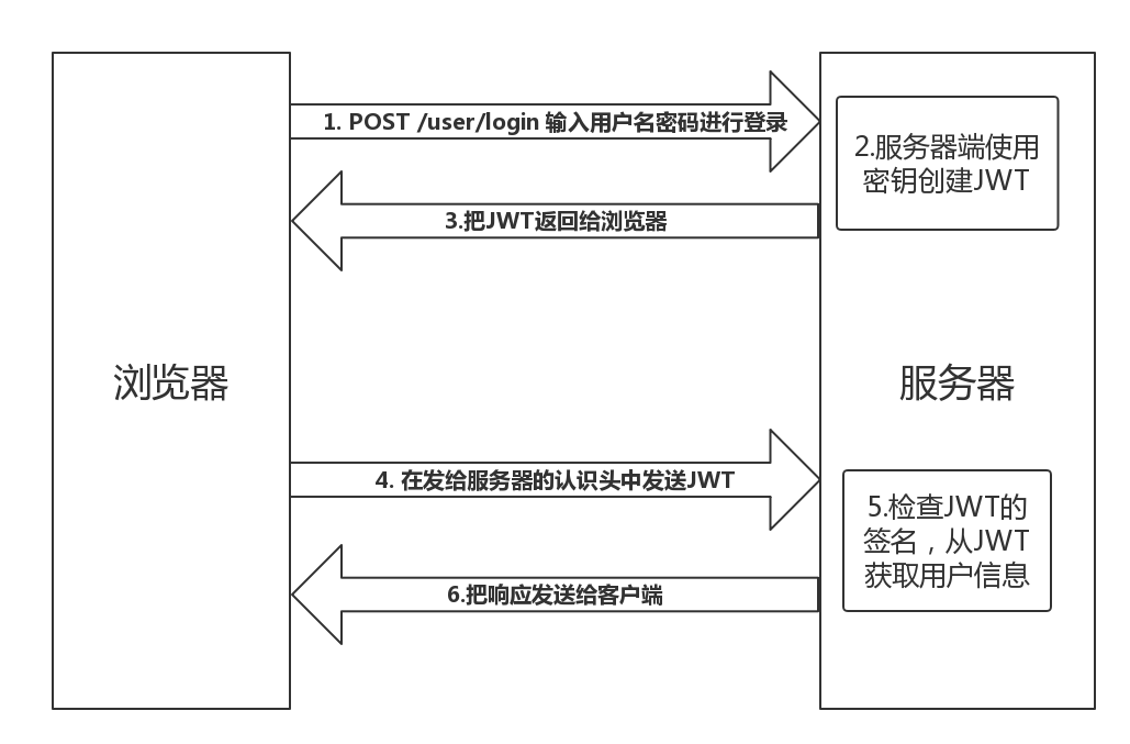 - 服务端的保护路由将会检查请求头 Authorization 中的 JWT 信息,如果合法,则允许用户的行为