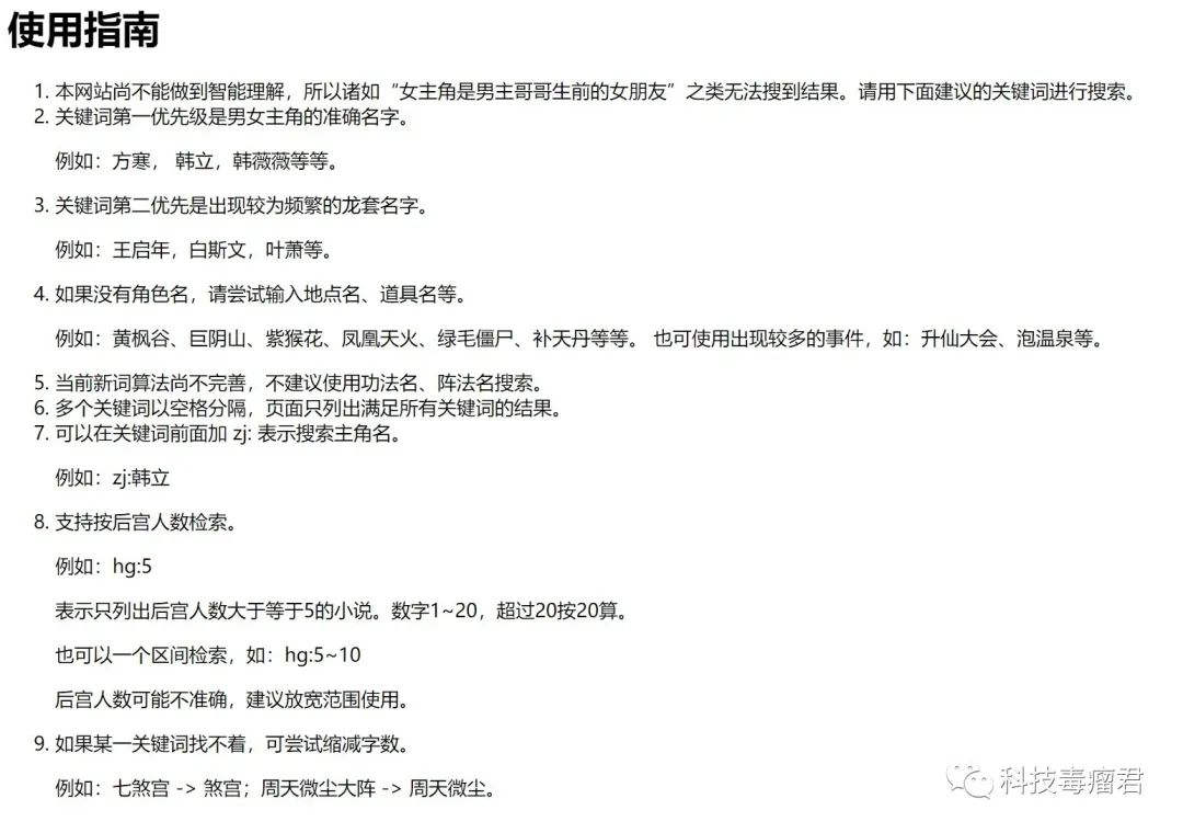 根据作者介绍,在搜索框内可通过各种零碎信息来搜索小说,例如输入主角名字、后宫人数、使用武器、招式、地名、门派等等,