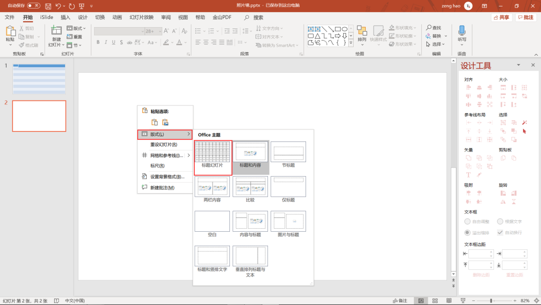 接下来我们关闭母版,回到页面,当然你也可以新建一页空白页面,在页面上右击,选择版式,点击刚才设置好的版式