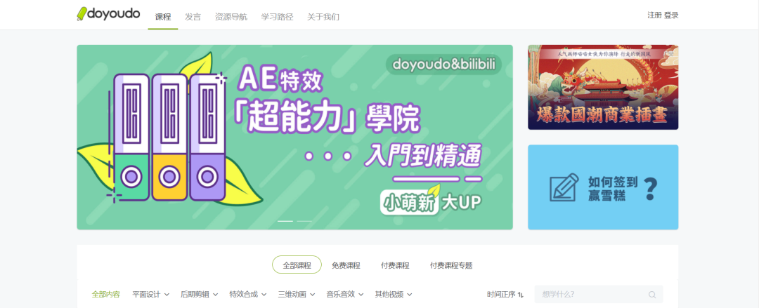 Doyoudo 是一个专注平面设计软件、视频剪辑软件的高质量自学网站,它免费提供了丰富的视频教程,这些视频教程的质量都很高,并且通俗易懂。