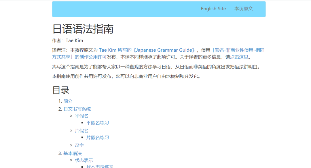 它提供的语法学习内容包括:简介、日语书写系统、基本语法、语法精要、特定的表达方式、高级话题。