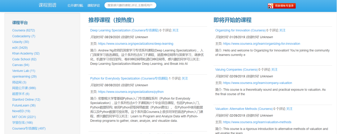 它聚合了多个课程网站的高质量公开课,并且按照课程平台精心分类,包括:Coursera 、Codecademy 、Udacity 、edX 、Khan Academy 、Code Schoo 、Canvas 、Venture La 、openlearning 、师徒网、网易公开课 、超星学术、Stanford Online 、FutureLearn 、NoveED 、MIT OCW 、学堂在线、Coursera 专项课程。