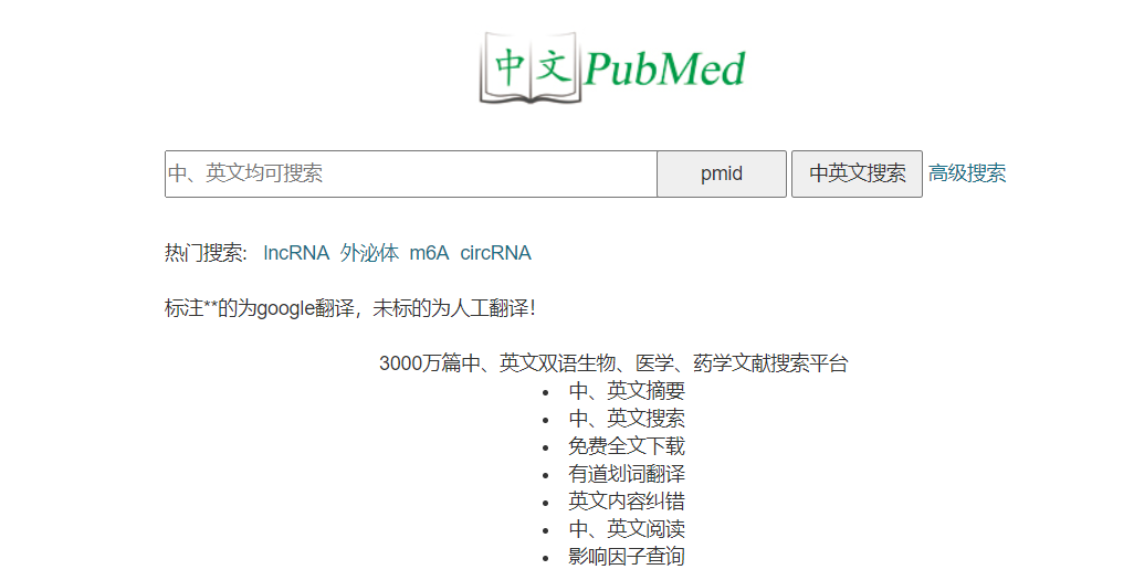 它收录了 3000 万篇中、英文双语生物、医学、药学文献,它支持中文搜索,支持英文搜索,支持 PMID 标识码搜索,并且搜索的速度非常快。