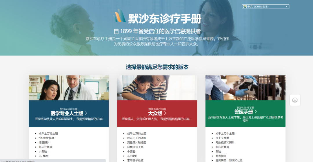 默沙东诊疗手册是一个高质量医学自学网站,它是世界使用最广泛的医学信息资源之一,它支持专业版、大众版、兽医版,其中专业版适合医疗专业人员和学生,大众版适合普通大众,兽医版适合兽医专业人员和学生。