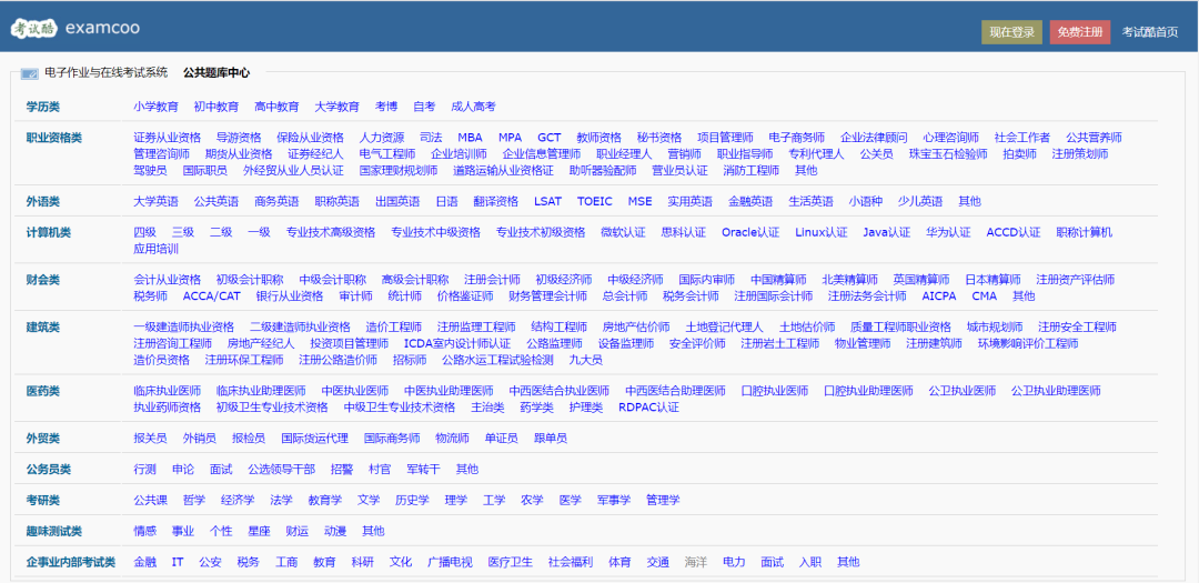 考试酷是一个永久免费的电子作业与在线考试系统云平台,今天主要介绍的是它的公共题库中心版块。它的公共题库中心提供了丰富的考试题库,并且这些考试题库全部支持免费查阅和测试;它对这些考试题库进行了详细并且精心的分类:学历类、职业资格类、外语类、计算机类、财会类、建筑类、医药类、外贸类、公务员类、考研类、企事业内部考试类。
