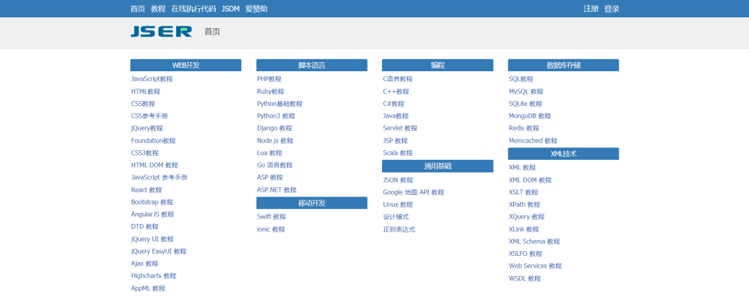其中 WEB 开发教程包括:JavaScript 、HTML 、CSS 、jQuery 、CSS3 、DOM 、React 、Bootstrap 、AngularJS 、Ajax 教程,还提供了 HTML 参考手册、CSS 参考手册、JavaScript 参考手册。