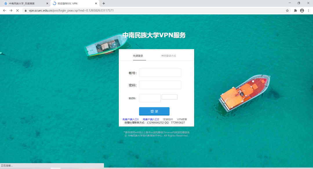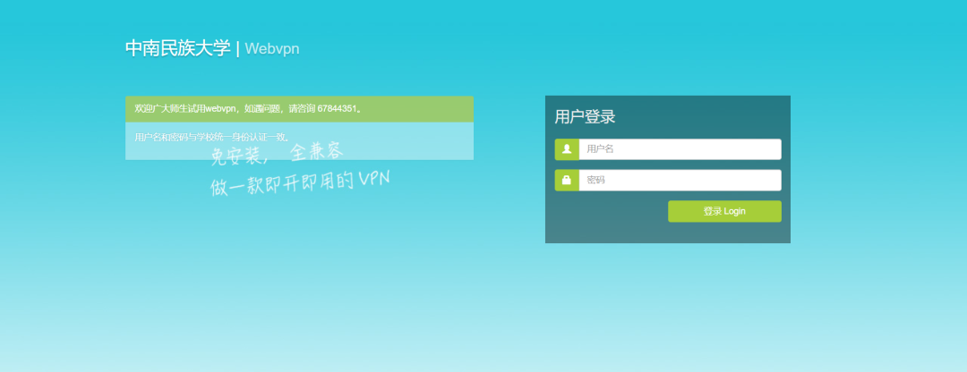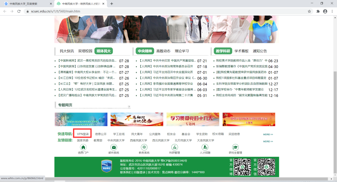 我们来到中南民族大学的首页,滑到最底部,我们可以看到一个【VPN登陆】