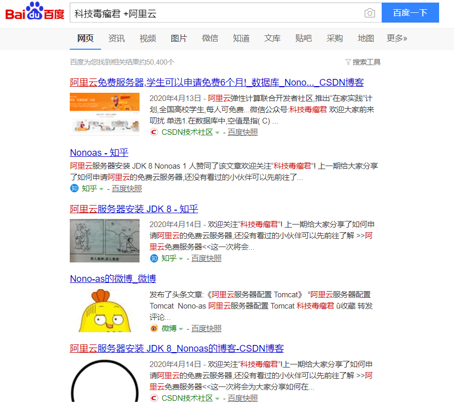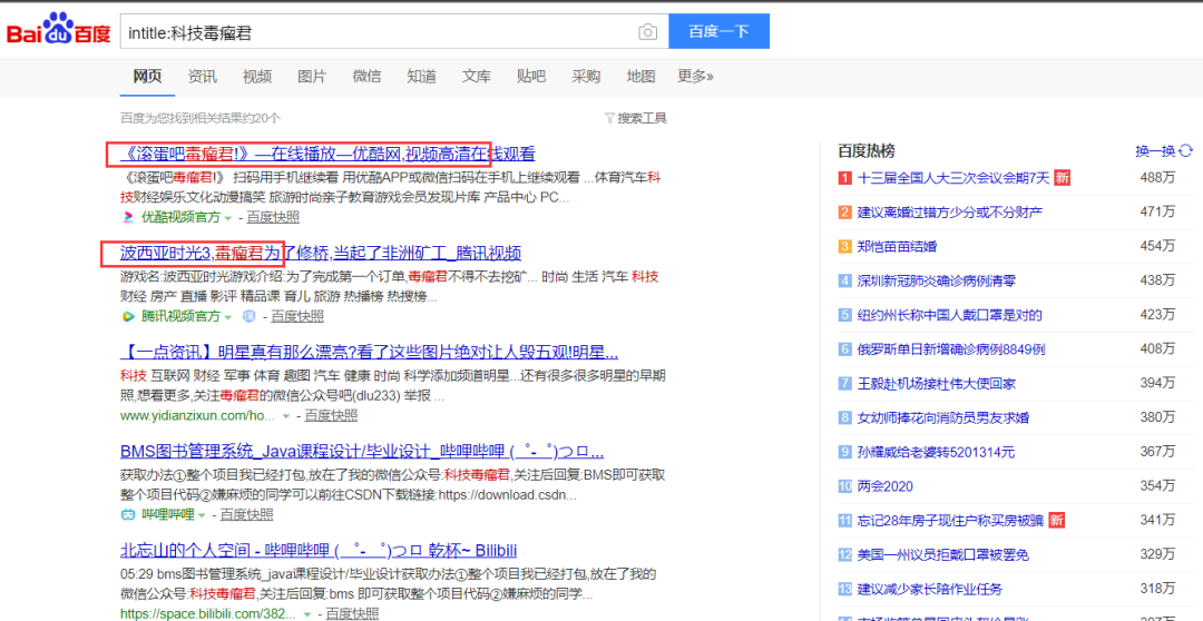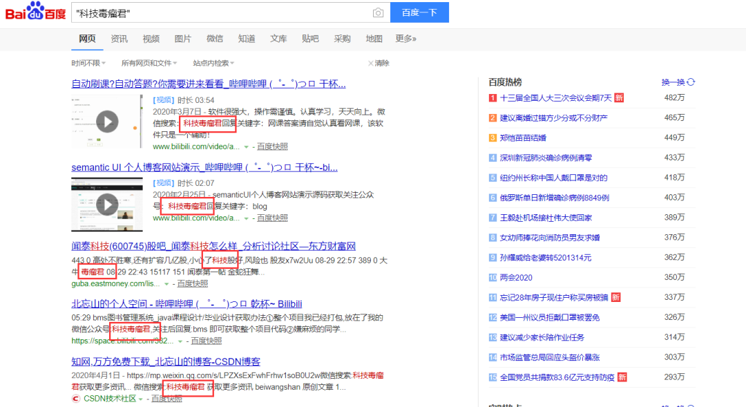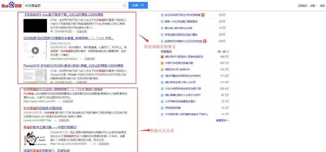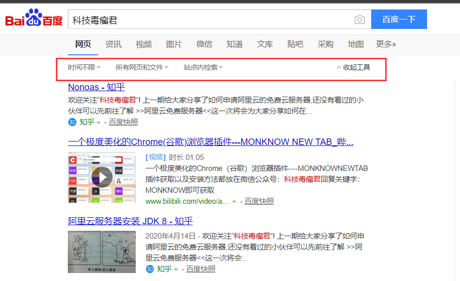 这应该是最常用的百度方法了,如下图可以看出,只要含有“科技毒瘤君”这五个字中的任意文字都会出现在搜索结果。