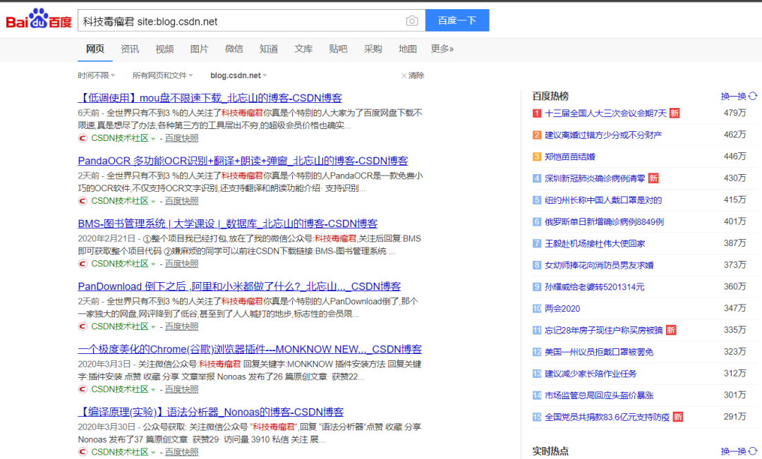 如下图,搜索结果为CSDN中含“科技毒瘤君”的信息。