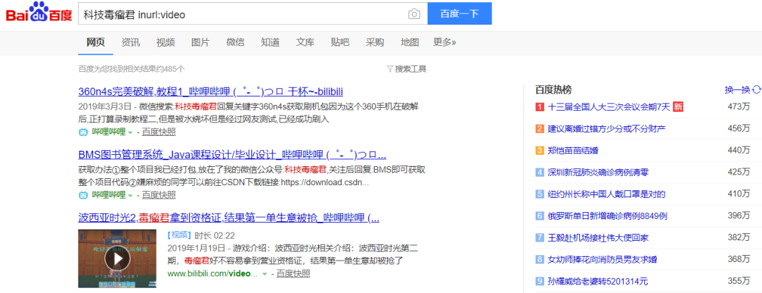 冒号是英文的,如图搜索结果得到的网页里一定包含视频。