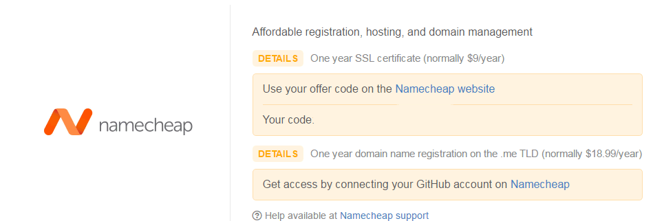 ⑦ Namecheap 提供一年 SSL 证书以及一年 .me 域名。需要注意的是 SSL 证书以优惠码形式提供,域名需要通过链接关联 GitHub 注册后登记。