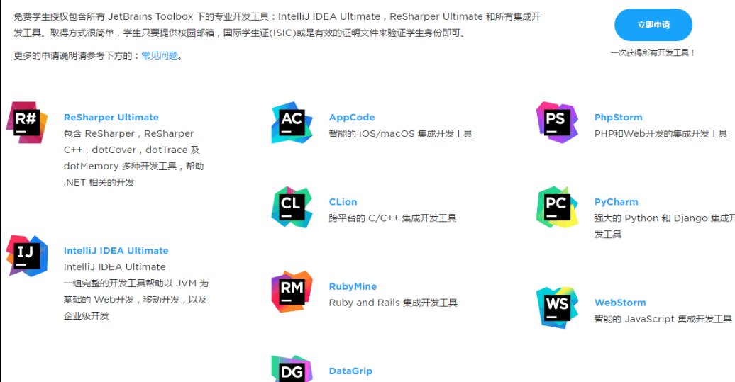 提供 JetBrains Toolbox 专业开发工具学生免费授权计划,即 JetBrains Toolbox 下所有开发工具统统免费,只需要 .edu 教育邮箱注册即可。