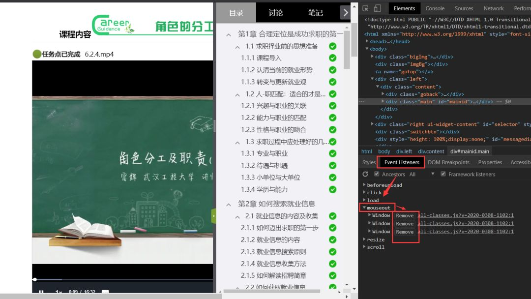 在网课播放页,右键->检测( 或者ctrl+shift+i ),进入开发者工具,点击EventListeners,把moseout下的监听全部remove掉。