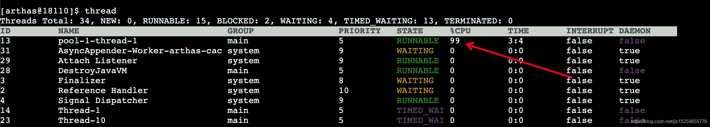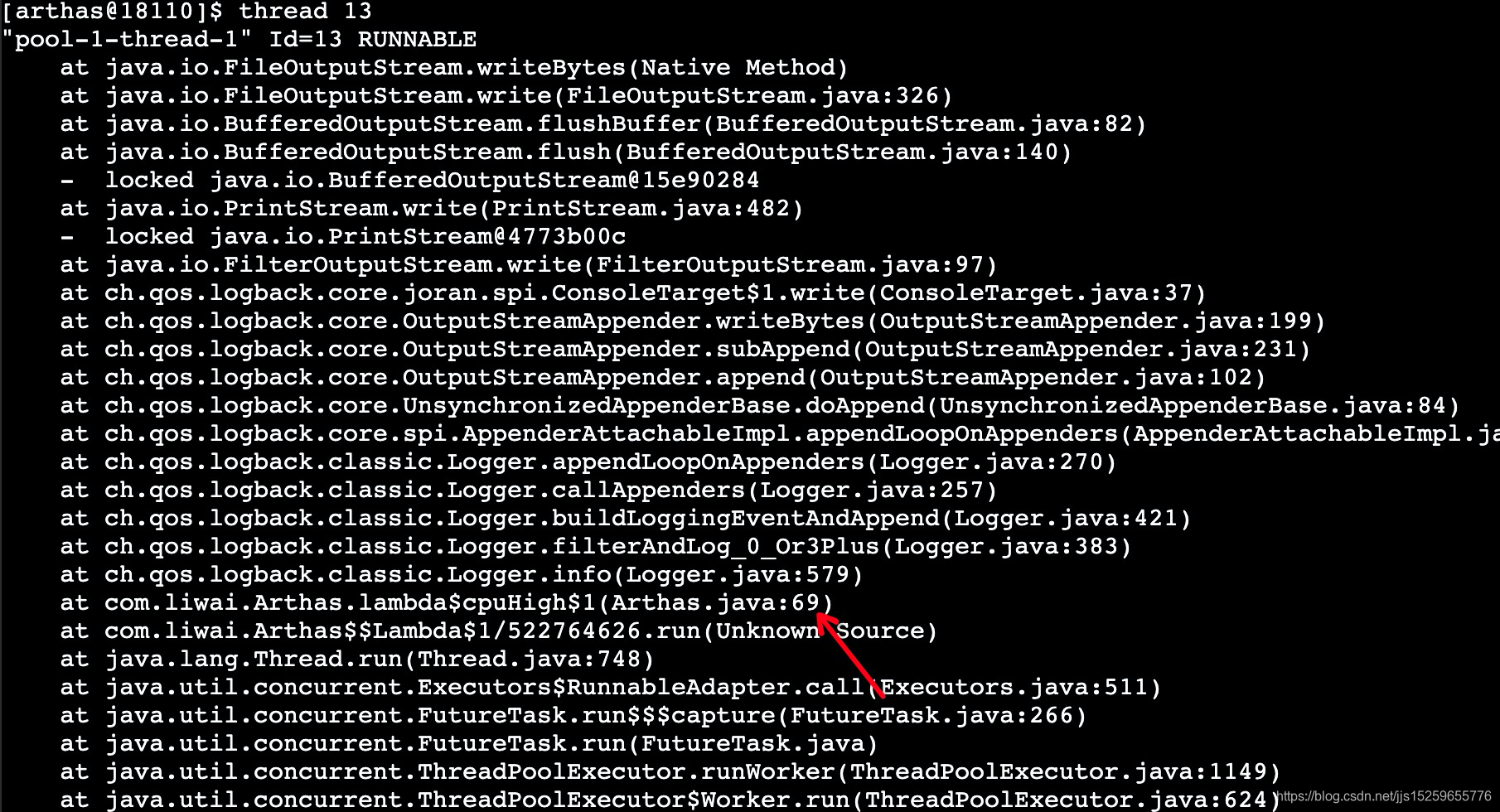 查看指定线程,可以看到具体是哪行代码导致的cpu暴涨