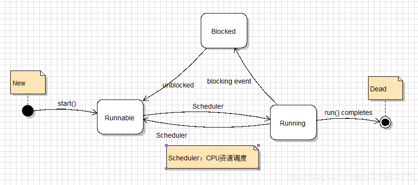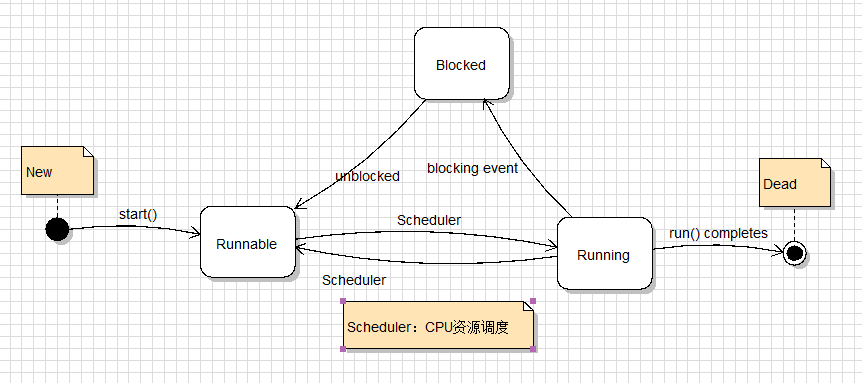 当线程别创建并启动以后,它既不是一启动就进入了执行状态,也不是一直处于执行状态,在线程的生命周期中,它要经过新建、就绪、运行、阻塞和死亡。