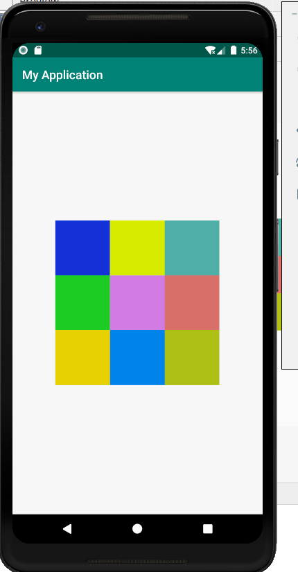 <?xml version="1.0" encoding="utf-8"?> <RelativeLayout xmlns:android="http://schemas.android.com/apk/res/android" xmlns:app="http://schemas.android.com/apk/res-auto" xmlns:tools="http://schemas.android.com/tools" android:id="@+id/r_1" android:layout_width="match_parent" android:layout_height="match_parent" android:padding="20dp"> <View android:id="@+id/v_1" android:layout_width="90dp" android:layout_height="90dp" android:background="#D47DE6" android:layout_centerInParent="true"/> <View android:id="@+id/v_2" android:layout_width="90dp" android:layout_height="90dp" android:background="#1231DA" android:layout_above="@id/v_1" android:layout_toLeftOf="@id/v_1"/> <View android:id="@+id/v_3" android:layout_width="90dp" android:layout_height="90dp" android:background="#1ACE21" android:layout_below="@id/v_2" android:layout_toLeftOf="@id/v_1"/> <View android:id="@+id/v_4" android:layout_width="90dp" android:layout_height="90dp" android:background="#EBD304" android:layout_toLeftOf="@id/v_1" android:layout_below="@id/v_3"/> <View android:id="@+id/v_5" android:layout_width="90dp" android:layout_height="90dp" android:background="#B1C210" android:layout_below="@id/v_1" android:layout_toRightOf="@id/v_1"/> <View android:id="@+id/v_6" android:layout_width="90dp" android:layout_height="90dp" android:background="#DB7069" android:layout_above="@id/v_5" android:layout_toRightOf="@id/v_1"/> <View android:id="@+id/v_7" android:layout_width="90dp" android:layout_height="90dp" android:background="#51B1A8" android:layout_above="@id/v_6" android:layout_toRightOf="@id/v_1"/> <View android:id="@+id/v_8" android:layout_width="90dp" android:layout_height="90dp" android:background="#0685EE" android:layout_below="@id/v_1" android:layout_toRightOf="@id/v_2"/> <View android:id="@+id/v_9" android:layout_width="90dp" android:layout_height="90dp" android:background="#DAEE06" android:layout_above="@id/v_1" android:layout_toRightOf="@id/v_2"/> </RelativeLayout>