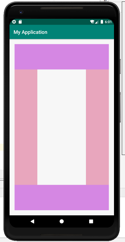 <?xml version="1.0" encoding="utf-8"?> <RelativeLayout xmlns:android="http://schemas.android.com/apk/res/android" xmlns:app="http://schemas.android.com/apk/res-auto" xmlns:tools="http://schemas.android.com/tools" android:id="@+id/r_1" android:layout_width="match_parent" android:layout_height="match_parent" android:layout_margin="20dp" android:orientation="horizontal"> <View android:id="@+id/v_1" android:layout_width="match_parent" android:layout_height="100dp" android:background="#D889E6" android:layout_alignParentTop="true"/> <View android:id="@+id/v_2" android:layout_width="match_parent" android:layout_height="100dp" android:background="#D889E6" android:layout_alignParentBottom="true"/> <View android:id="@+id/v_3" android:layout_width="90dp" android:layout_height="500dp" android:layout_below="@id/v_1" android:layout_above="@id/v_2" android:background="#EBA8BF" android:layout_alignParentLeft="true"/> <View android:id="@+id/v_4" android:layout_width="90dp" android:layout_height="500dp" android:layout_below="@id/v_1" android:layout_above="@id/v_2" android:background="#EBA8BF" android:layout_alignParentRight="true"/> </RelativeLayout>