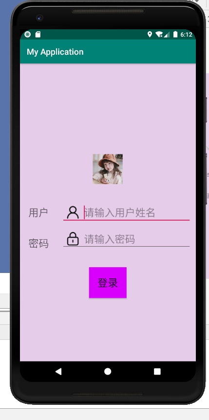 <?xml version="1.0" encoding="utf-8"?> <RelativeLayout xmlns:android="http://schemas.android.com/apk/res/android" xmlns:app="http://schemas.android.com/apk/res-auto" xmlns:tools="http://schemas.android.com/tools" android:id="@+id/r_1" android:layout_width="match_parent" android:layout_height="match_parent" android:background="#E8CFEC" tools:context=".MainActivity" android:orientation="vertical"> <TextView android:id="@+id/tv_1" android:layout_width="wrap_content" android:layout_height="wrap_content" android:text="用户" android:textSize="24sp" android:layout_margin="10dp" android:padding="10dp" android:layout_centerVertical="true"/> <TextView android:id="@+id/tv_2" android:layout_width="wrap_content" android:layout_height="wrap_content" android:text="密码" android:textSize="24sp" android:layout_margin="10dp" android:padding="10dp" android:layout_below="@id/tv_1" android:layout_centerVertical="true"/> <EditText android:id="@+id/et_1" android:layout_width="match_parent" android:layout_height="wrap_content" android:layout_centerVertical="true" android:hint="请输入用户姓名" android:textColor="#000000" android:textSize="24sp" android:layout_margin="10dp" android:padding="10dp" android:layout_toRightOf="@id/tv_1" android:drawableLeft="@drawable/denglu" android:drawablePadding="10dp"/> <EditText android:id="@+id/et_2" android:layout_width="match_parent" android:layout_height="wrap_content" android:layout_below="@id/tv_1" android:layout_centerVertical="true" android:hint="请输入密码" android:textColor="#000000" android:textSize="24sp" android:layout_marginLeft="10dp" android:layout_marginRight="10dp" android:padding="10dp" android:layout_toRightOf="@id/tv_2" android:drawableLeft="@drawable/kw" android:drawablePadding="10dp" android:inputType="textPassword"/> <Button android:layout_width="wrap_content" android:layout_height="wrap_content" android:layout_below="@id/et_2" android:layout_centerHorizontal="true" android:layout_margin="40dp" android:padding="20dp" android:background="#DB0CFF" android:text="登录" android:textSize="24sp"/> <ImageView android:layout_width="70dp" android:layout_height="70dp" android:layout_above="@id/et_1" android:layout_centerInParent="true" android:layout_marginBottom="30dp" android:src="@drawable/tp"/> </RelativeLayout>