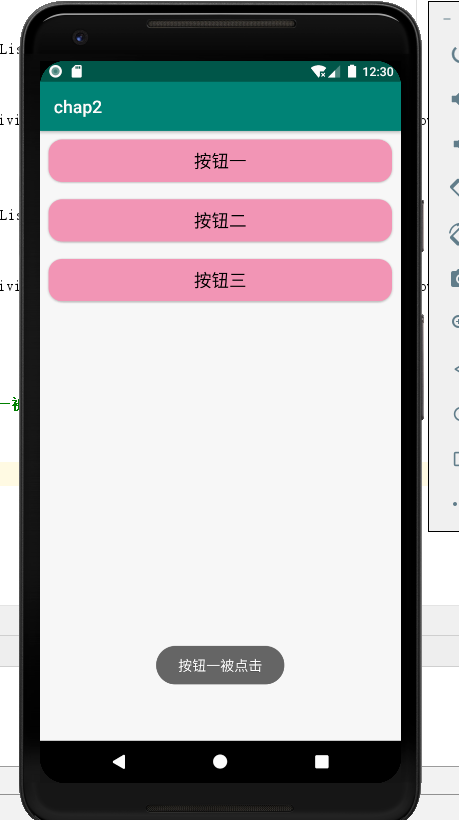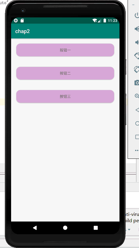 <?xml version="1.0" encoding="utf-8"?> <LinearLayout xmlns:android="http://schemas.android.com/apk/res/android" xmlns:app="http://schemas.android.com/apk/res-auto" xmlns:tools="http://schemas.android.com/tools" android:layout_width="match_parent" android:layout_height="match_parent" android:orientation="vertical"> <Button android:id="@+id/bt_1" android:layout_width="match_parent" android:layout_height="wrap_content" android:background="@drawable/btn_2" android:text="按钮一" android:textSize="20sp" android:textColor="#000000" android:layout_margin="10dp" android:onClick="click1"/> <Button android:id="@+id/bt_2" android:layout_width="match_parent" android:layout_height="wrap_content" android:background="@drawable/btn_2" android:text="按钮二" android:textSize="20sp" android:textColor="#000000" android:layout_margin="10dp"/> <Button android:id="@+id/bt_3" android:layout_width="match_parent" android:layout_height="wrap_content" android:background="@drawable/btn_2" android:text="按钮三" android:textSize="20sp" android:textColor="#000000" android:layout_margin="10dp"/> </LinearLayout>