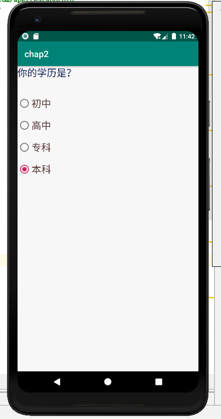 <?xml version="1.0" encoding="utf-8"?> <RelativeLayout xmlns:android="http://schemas.android.com/apk/res/android" xmlns:app="http://schemas.android.com/apk/res-auto" xmlns:tools="http://schemas.android.com/tools" android:layout_width="match_parent" android:layout_height="match_parent" android:orientation="vertical"> <TextView android:id="@+id/tv_1" android:layout_width="match_parent" android:layout_height="60dp" android:text="你的学历是?" android:textSize="10pt" android:textColor="#0E1652"/> <RadioButton android:id="@+id/rb_1" android:layout_width="200dp" android:layout_height="50dp" android:text="初中" android:textSize="10pt" android:textColor="#553232" android:layout_below="@id/tv_1"/> <RadioButton android:id="@+id/rb_2" android:layout_width="200dp" android:layout_height="50dp" android:text="高中" android:textSize="10pt" android:textColor="#553232" android:layout_below="@id/rb_1"/> <RadioButton android:id="@+id/rb_3" android:layout_width="200dp" android:layout_height="50dp" android:text="专科" android:textSize="10pt" android:textColor="#553232" android:layout_below="@id/rb_2"/> <RadioButton android:id="@+id/rb_4" android:layout_width="200dp" android:layout_height="50dp" android:text="本科" android:textSize="10pt" android:textColor="#553232" android:layout_below="@id/rb_3" android:checked="true"/> </RelativeLayout>