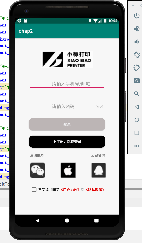 <?xml version="1.0" encoding="utf-8"?> <RelativeLayout xmlns:android="http://schemas.android.com/apk/res/android" xmlns:app="http://schemas.android.com/apk/res-auto" xmlns:tools="http://schemas.android.com/tools" android:layout_width="match_parent" android:layout_height="match_parent" android:orientation="vertical"> <ImageView android:id="@+id/iv_1" android:layout_width="wrap_content" android:layout_height="wrap_content" android:background="@drawable/dayin" android:layout_centerHorizontal="true" android:layout_marginTop="50dp"/> <EditText android:id="@+id/et_1" android:layout_width="300dp" android:layout_height="wrap_content" android:hint="请输入手机号/邮箱" android:layout_below="@id/iv_1" android:layout_centerHorizontal="true" android:paddingLeft="90dp" android:layout_marginTop="40dp"/> <EditText android:id="@+id/et_2" android:layout_width="300dp" android:layout_height="wrap_content" android:hint="请输入密码" android:layout_below="@id/et_1" android:layout_centerHorizontal="true" android:layout_marginTop="40dp" android:paddingLeft="90dp" android:drawableRight="@drawable/mima"/> <Button android:id="@+id/bt_1" android:layout_width="300dp" android:layout_height="wrap_content" android:text="登录" android:textColor="#F6F6F8" android:layout_centerHorizontal="true" android:layout_below="@id/et_2" android:textStyle="bold" android:background="@drawable/btn_1" android:layout_marginTop="20dp"/> <Button android:id="@+id/bt_2" android:layout_width="300dp" android:layout_height="wrap_content" android:text="不注册,跳过登录" android:textColor="#F6F6F8" android:layout_centerHorizontal="true" android:layout_below="@id/bt_1" android:textStyle="bold" android:background="@drawable/btn_2" android:layout_marginTop="20dp"/> <TextView android:id="@+id/tv_1" android:layout_width="wrap_content" android:layout_height="wrap_content" android:text="注册账号" android:layout_below="@id/bt_2" android:layout_marginLeft="60dp" android:layout_marginTop="20dp"/> <TextView android:id="@+id/tv_2" android:layout_width="wrap_content" android:layout_height="wrap_content" android:text="忘记密码" android:layout_below="@id/bt_2" android:layout_marginLeft="300dp" android:layout_marginTop="20dp"/> <ImageView android:id="@+id/ig_1" android:layout_width="60dp" android:layout_height="60dp" android:layout_below="@id/tv_1" android:background="@drawable/weixin" android:layout_marginLeft="60dp" android:layout_marginTop="20dp"/> <ImageView android:id="@+id/ig_2" android:layout_width="60dp" android:layout_height="60dp" android:layout_below="@id/tv_1" android:background="@drawable/apple" android:layout_marginLeft="60dp" android:layout_marginTop="20dp" android:layout_toRightOf="@id/ig_1"/> <ImageView android:id="@+id/ig_3" android:layout_width="60dp" android:layout_height="60dp" android:layout_below="@id/tv_1" android:background="@drawable/qq" android:layout_marginLeft="60dp" android:layout_marginTop="20sp" android:layout_toRightOf="@id/ig_2"/> <CheckBox android:id="@+id/ck_1" android:layout_width="wrap_content" android:layout_height="wrap_content" android:text="已阅读并同意" android:layout_below="@id/ig_1" android:layout_marginTop="30dp" android:layout_marginLeft="60dp"/> <TextView android:id="@+id/tv_3" android:layout_width="wrap_content" android:layout_height="wrap_content" android:text="《用户协议》" android:textColor="#E20707" android:layout_below="@id/ig_1" android:textStyle="bold" android:layout_toRightOf="@id/ck_1" android:layout_marginTop="37dp"/> <TextView android:id="@+id/tv_4" android:layout_width="wrap_content" android:layout_height="wrap_content" android:text="和" android:layout_below="@id/ig_1" android:layout_toRightOf="@id/tv_3" android:layout_marginTop="37dp"/> <TextView android:id="@+id/tv_5" android:layout_width="wrap_content" android:layout_height="wrap_content" android:text="《隐私政策》" android:textColor="#E20707" android:layout_below="@id/ig_1" android:textStyle="bold" android:layout_toRightOf="@id/tv_4" android:layout_marginTop="37dp"/> </RelativeLayout>