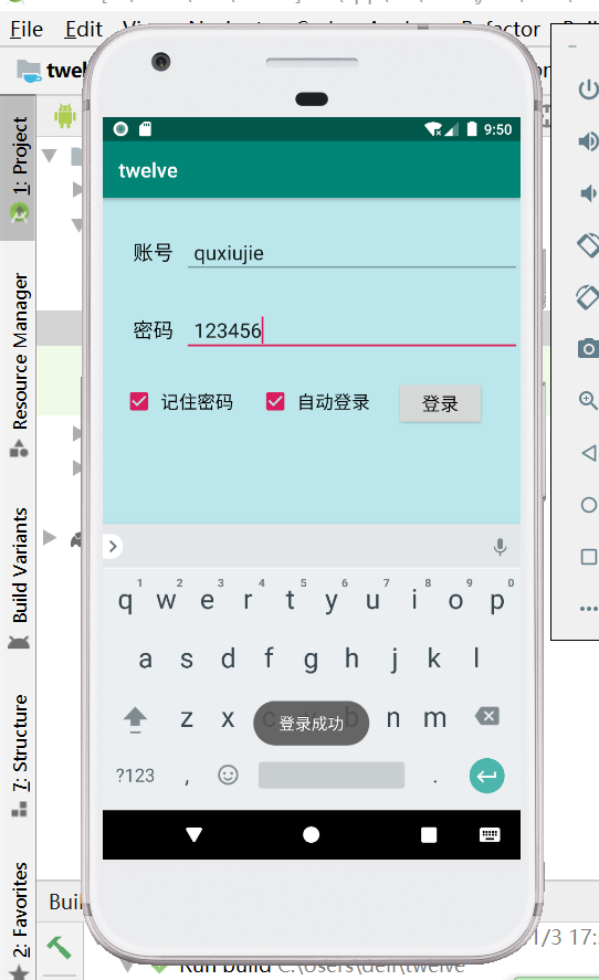 <?xml version="1.0" encoding="utf-8"?> <RelativeLayout xmlns:android="http://schemas.android.com/apk/res/android" xmlns:app="http://schemas.android.com/apk/res-auto" xmlns:tools="http://schemas.android.com/tools" android:layout_width="match_parent" android:layout_height="match_parent" android:background="#BBE7EC" tools:context=".MainActivity"> <TextView android:id="@+id/tv_1" android:layout_width="wrap_content" android:layout_height="wrap_content" android:text="账号" android:textColor="#000000" android:textSize="20sp" android:layout_marginTop="30dp" android:layout_marginLeft="20dp" android:padding="10dp"/> <EditText android:id="@+id/et_1" android:layout_width="match_parent" android:layout_height="wrap_content" android:hint="请输入用户名" android:layout_toRightOf="@id/tv_1" android:layout_marginTop="30dp" android:padding="10dp" android:textSize="20sp"/> <TextView android:id="@+id/tv_2" android:layout_width="wrap_content" android:layout_height="wrap_content" android:text="密码" android:textColor="#000000" android:textSize="20sp" android:layout_marginTop="30dp" android:layout_marginLeft="20dp" android:layout_below="@id/tv_1" android:padding="10dp"/> <EditText android:id="@+id/et_2" android:layout_width="match_parent" android:layout_height="wrap_content" android:hint="请输入密码" android:layout_toRightOf="@id/tv_2" android:layout_below="@id/et_1" android:layout_marginTop="30dp" android:padding="10dp" android:textSize="20sp"/> <CheckBox android:id="@+id/cb_1" android:layout_width="wrap_content" android:layout_height="wrap_content" android:text="记住密码" android:textColor="#000000" android:textSize="18sp" android:layout_below="@id/tv_2" android:padding="5dp" android:layout_marginTop="30dp" android:layout_marginLeft="20dp"/> <CheckBox android:id="@+id/cb_2" android:layout_width="wrap_content" android:layout_height="wrap_content" android:text="自动登录" android:textColor="#000000" android:textSize="18sp" android:layout_below="@id/tv_2" android:layout_toRightOf="@id/cb_1" android:padding="5dp" android:layout_marginTop="30dp" android:layout_marginLeft="20dp"/> <Button android:id="@+id/btn_1" android:layout_width="wrap_content" android:layout_height="wrap_content" android:text="登录" android:textColor="#000000" android:textSize="18sp" android:layout_below="@id/tv_2" android:padding="5dp" android:layout_marginTop="25dp" android:layout_marginLeft="20dp" android:layout_toRightOf="@id/cb_2"/> </RelativeLayout>