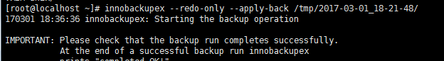 最后我们看见completed ok!就代表成功了~ (另外这里提一句使用innobackupex,执行任何备份、恢复操作在结束处都应该见到complete ok,即代表成功)