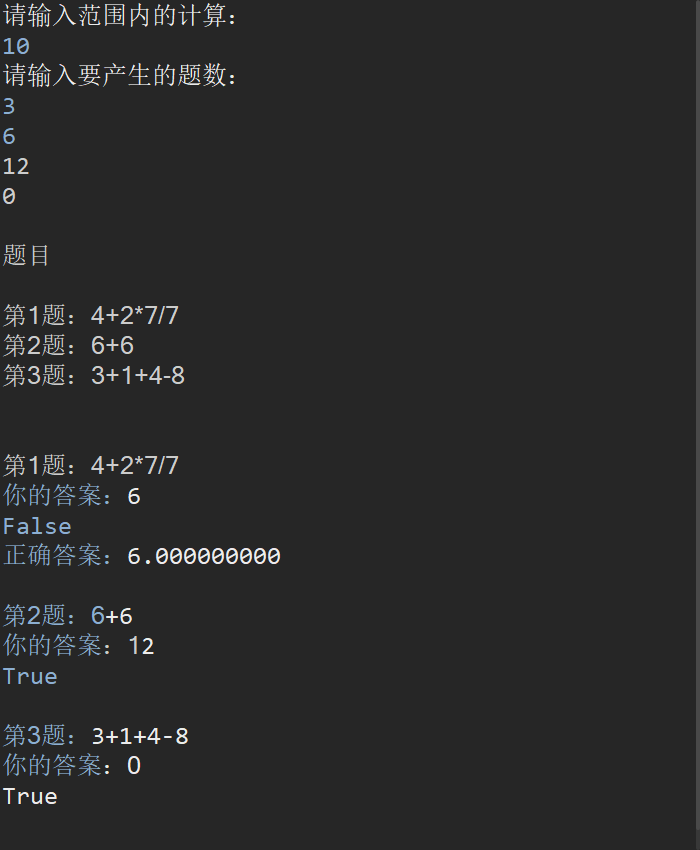 - 了解四则运算的大概思路,即:生成四则运算式子;用户输入结果;程序检验用户输入的结果是否正确;若用户输入的结果错误,即把正确答案输入。