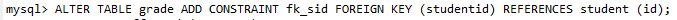 ALTER TABLE 表名 ADD CONSTRAINT 外键名 FOREIGN KEY (外键所在字段名) REFERENCES 被引用的表 (被引用的字段名);