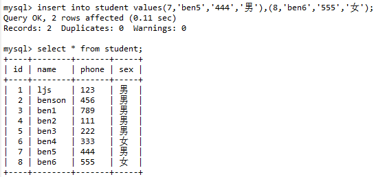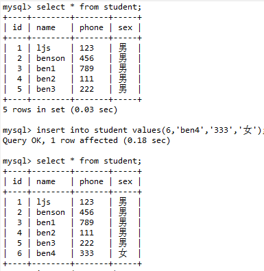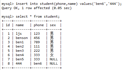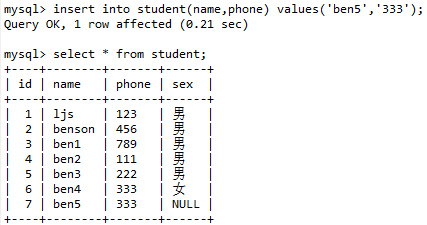 # 字段个数任选,不写默认是全部字段,values后面的数据要跟字段一一对应。自增的主键数据也不能省略。如果是自选字段,可以为空的字段和自增主键的数据可以省略