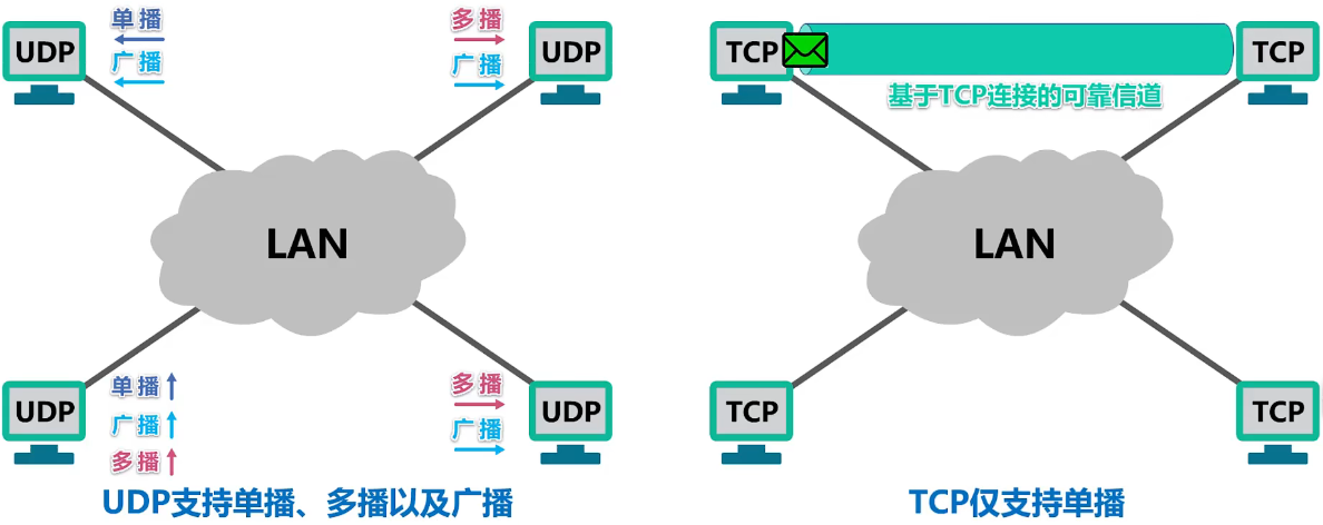 UDP支持单播、多播(一对多)、广播,TCP仅支持单播