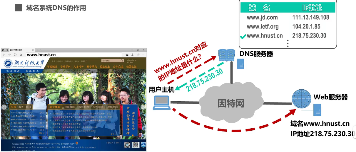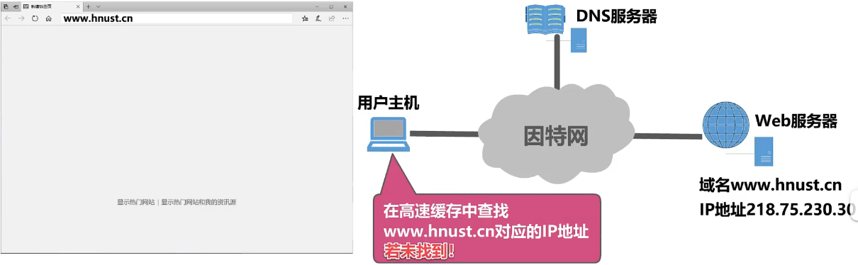 当我们在浏览器中输入某个web服务器的域名时,用户主机首先会在自己的DNS高速缓存表中查询域名对应的ip,若未找到则会向网络中某台DNS服务器查询。